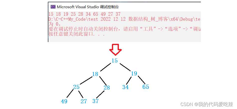 {//定义Heap hp;//初始化HeapInit(&hp);int array[] = { 27,15,19,18,28,34,65,49,25,37 };int n = sizeof(array) / sizeof(array[0]);//数组数据一次插入堆中for (int i = 0; i < n; i++){HeapPush(&hp, array[i]);}//打印堆的内容Print(&hp);//销毁堆HeapDestroy(&hp);return 0;