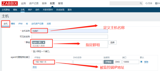 配置→主机→创建主机→指定主机名称→指定群组→代理服务器IP(被监控端IP)→添加。