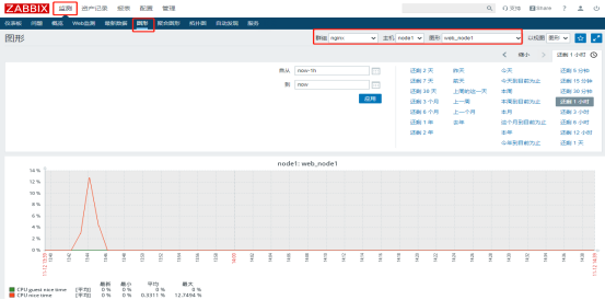 点击监测→图形→选择群组→主机→监控类型,就可以看到当前被监控端的信息,但是可以看到下方数据有乱码现象,需要在zabbix服务器安装字体包。