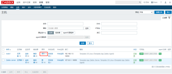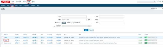 添加后稍等片刻就可以看到新建的主机成功,添加的模板等都可以看到。下面Zabbix server是zabbix服务器本机,本机也是可以被监控的(自己监控自己)。
