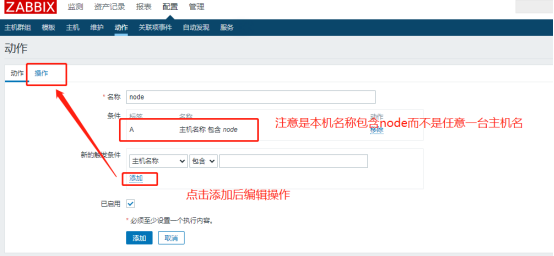 配置→动作→事件源(自动注册)→创建动作→填写名称→触发条件主机名→操作(主机、群组、模板)。