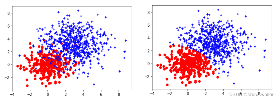 这次均值和协方差都变大了很多,由此可见 高斯混合聚类对重合部分的点并不能很好的预测,分簇结果有一条明显的分界线,该分界线是两个模型计算概率值相等的地方
