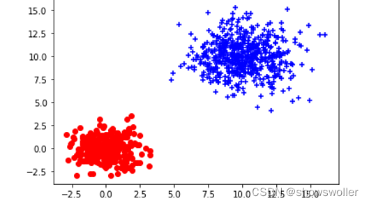 以(0,0)和(10,10)为中心,以1.2和1.8为标准差,分别生成两个簇。