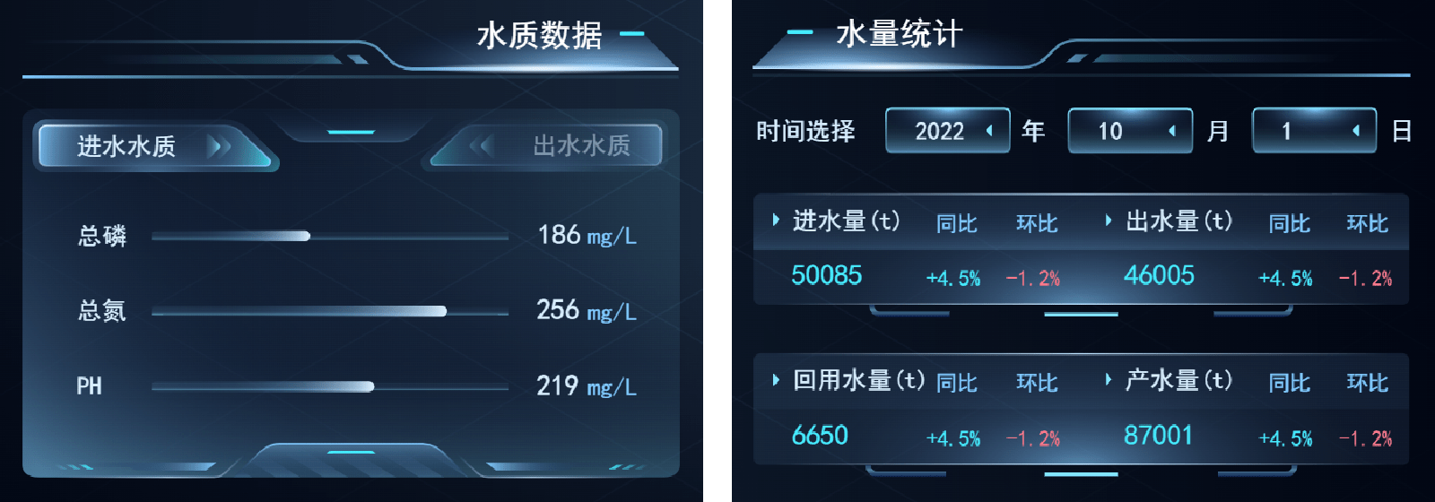画面两侧数据面板展示厂区设备运维的能耗、运营成本、实时报警、街道供水量等关键指标参数,将采集的数据信息转化为相应的图形信息,直观的展示全厂各工艺流程段的实时设备工况,使管理人员及时掌握水厂运行情况。