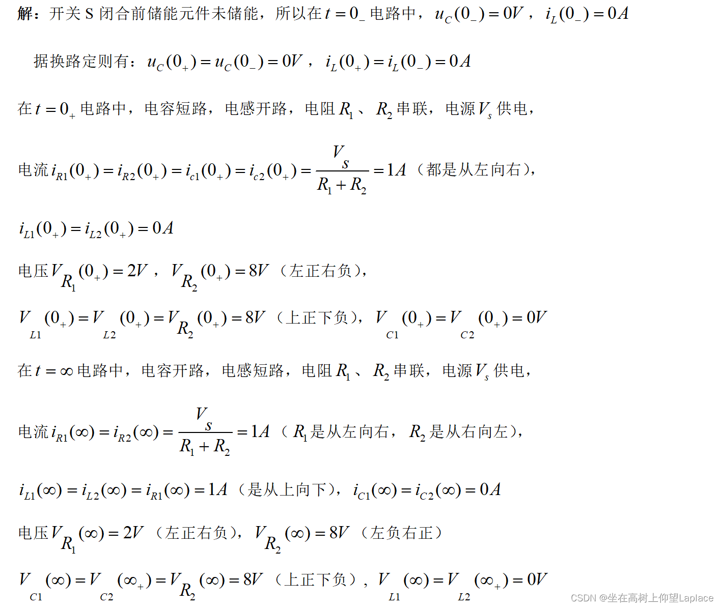 关于结论2,在0-的那一瞬间,因为没有储能,u_{C}=0,所以电容看作短路,i_{L}=0,所以电感看作开路。