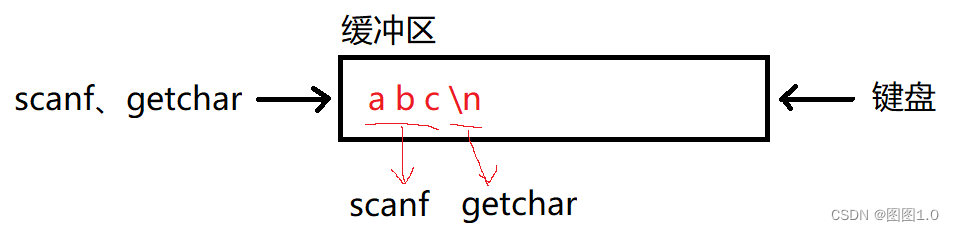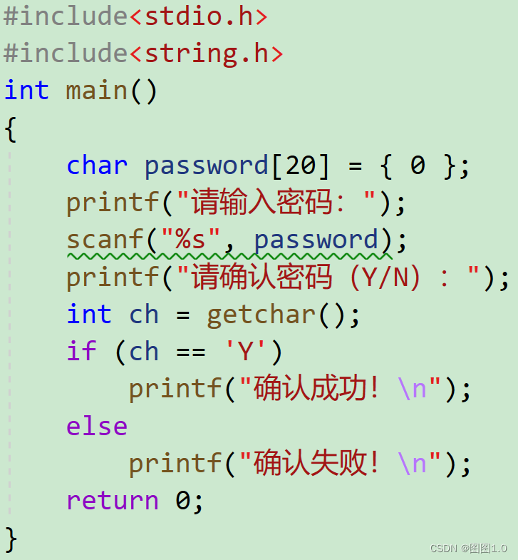这里不会等待用户输入Y/N,就直接输出确认失败。因为有输入缓冲区,用户输入密码后,会按下回车键,假设密码是abc,那么加上回车,进入到缓冲区的就是abc\n,而scanf只会读取空格或\n之前的,所以password中存放abc,但是缓冲区中还有\n,getchar过来看到有一个字符就直接读取,所以ch中放的是\n,所以比较会失败。
