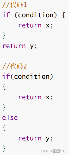 1、代码1和代码2都是要表达:条件满足返回x,否则返回y。显然代码2看起来更舒服,推荐代码2的书写。