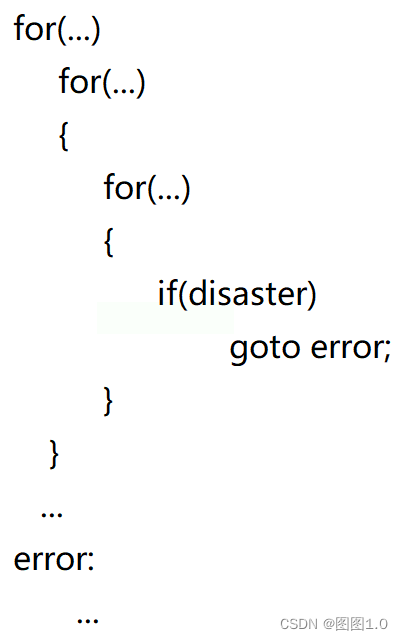 2、从理论上goto语句是没有必要的,实践中没有goto语句也可以很容易的写出代码。但是某些场合下goto语句还是用得着的,最常见的用法就是终止程序在某些深度嵌套的结构的处理过程。例如:一次跳出两层或多层循环。多层循环这种情况使用break是达不到目的的。它只能从最内层循环退出到上一层的循环。