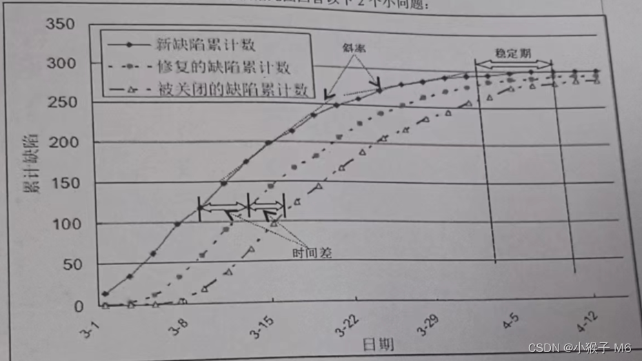 6. 下图是累积缺陷数的理想趋势图,请根据此图回答以下2个问题。