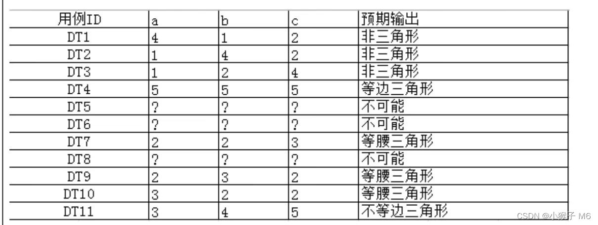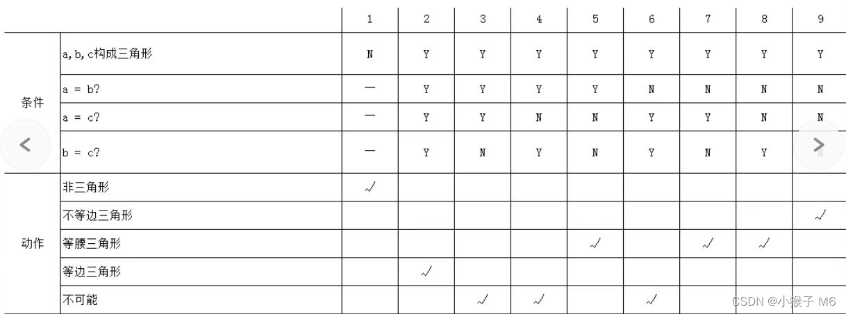 4. 根据输入3条边(a、b、c)边长的值来判断是否构成一个三角形。如果是三角形,继续判断是等腰三角形还是等边三角形等。为简化问题,a、b、c 只能输入大于零的数,不需要考虑 a、b、c 取零或负数的情况。请使用决策表的方法制定决策表并设计测试用例。