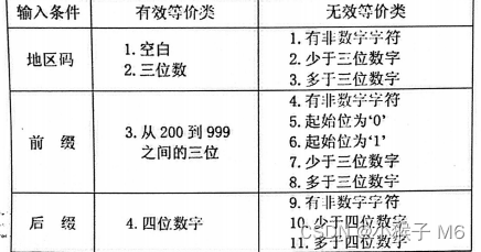 假定被测程序能接受一切符合上述规定的电话号码,拒绝所有不符合规定的电话号码。试根据该程序的规格说明,划分其等价类,并用表格形式表示出来。