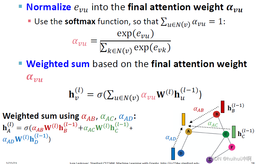 (3)基于attention weight加权求和计算节点v的第l层的embedding