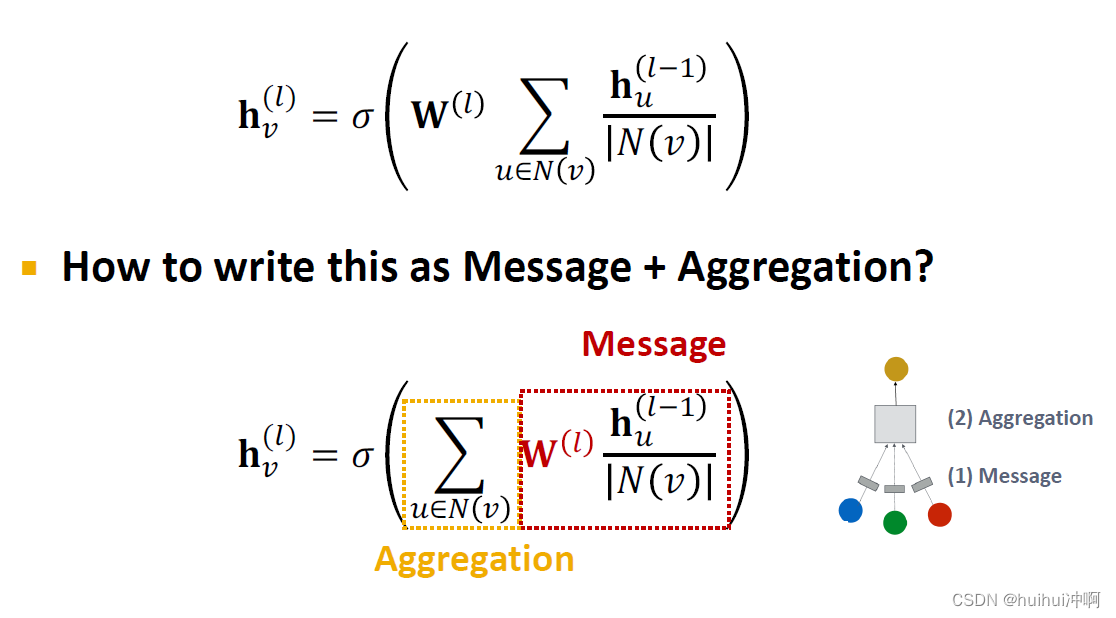 包含两部分: Message(节点嵌入的转换)与Aggregation(聚合来自不同节点的message)