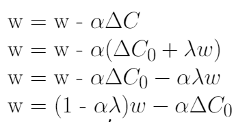 得到损失函数的偏导数结果后,将结果代入梯度下降学习规则中,代入后,打开括号,重新排列,使其等价于在一定假设下的权值衰减方程。