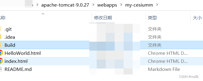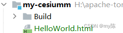创建一个名为my-cesium的文件夹,将下载好的Cesium中的Build文件夹和Apps中的HelloWorld.html复制到文件夹中。