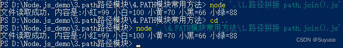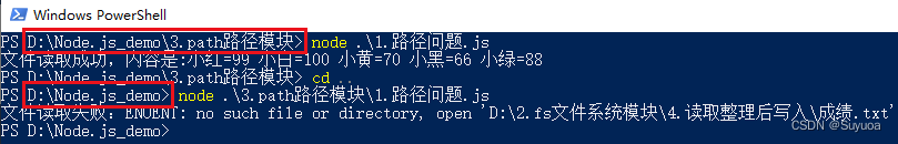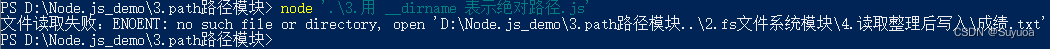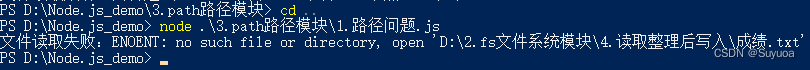 这是因为在node中,相对路径就是用执行路径拼接的,第一次使用的是 代码所在的路径 进行拼接所以没有问题,第二次使用 不是代码所在的路径 所以拼接有问题。你看它的错误信息就理解这个问题了