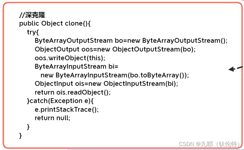 在代码中可以看出,重写clone方法时,利用了对象序列化的转换而达到的克隆效果,实际此代码并没将对象状态写入永久文件,而是将代码在内存中以Byte的类型进行了一次转换(写入及读取)。