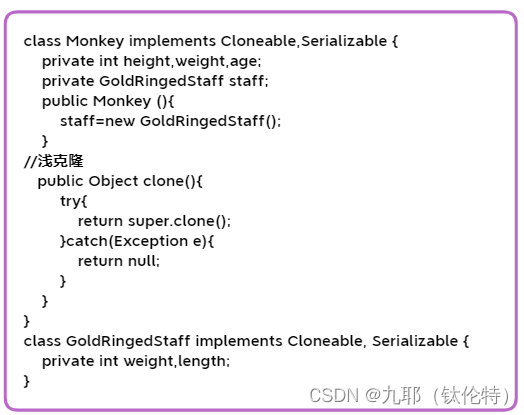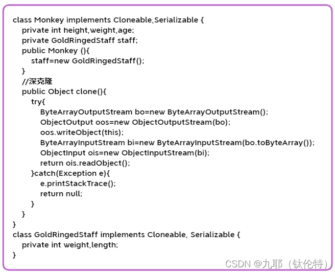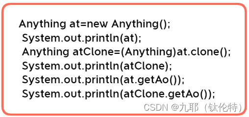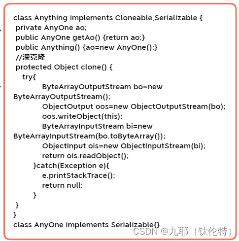 “class Anything”是将要克隆的一个类,必须实现Cloneable接口以支持clone功能,还要实现Serializable接口以支持序列化功能。(至于什么是序列化请参考IO技能中的“序列化与反序列化”的知识点取查阅。)