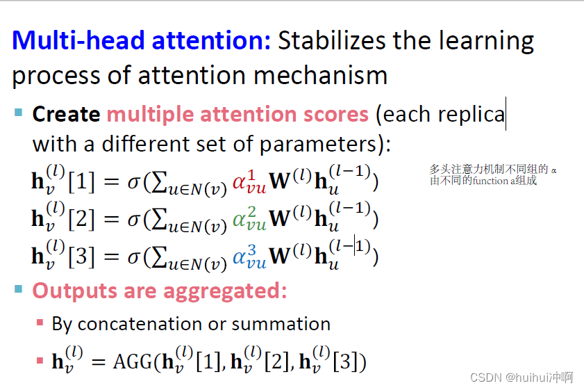 多头注意力机制不同组的α由不同的function a组成,最后计算节点v的第l层的embedding,可以拼接或者求和。