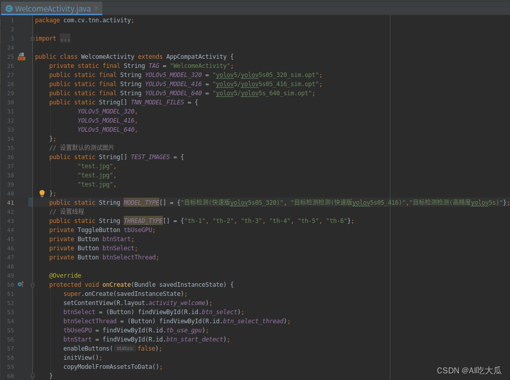 package com.cv.tnn.model;import android.graphics.Bitmap;public class Detector {static {System.loadLibrary("tnn_wrapper");}/**** 初始化模型* @param model: TNN *.tnnmodel文件文件名(含后缀名)* @param root:模型文件的根目录,放在assets文件夹下* @param model_type:模型类型* @param num_thread:开启线程数* @param useGPU:关键点的置信度,小于值的坐标会置-1*/public static native void init(String model, String root, int model_type, int num_thread, boolean useGPU);/**** 检测* @param bitmap 图像(bitmap),ARGB_8888格式* @param score_thresh:置信度阈值* @param iou_thresh: IOU阈值* @return*/public static native FrameInfo[] detect(Bitmap bitmap, float score_thresh, float iou_thresh);