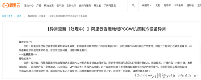 随后阿里云方面发布公告表示,阿里云官网 12 月 18 日下午更新处理进展称,经排查,阿里云香港地域故障确认为香港 PCCW 机房制冷设备故障所致,影响香港地域可用区C的云服务器 ECS、云数据库、存储产品(对象存储、表格存储等)、云网络产品 (全球加速、NAT 网关、VPN 网关等) 等云产品使用。
