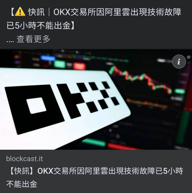 知名交易平台“Gate.io”发布公告表示,受运营商部分网络节点维护影响,充提服务将出现延缓。而另一主流交易所“欧易OKX”则是选择直接关停所有用户的交易并限制提币。可想而知,此次故障将会对交易所上投资者信心产生不可估量的打击。