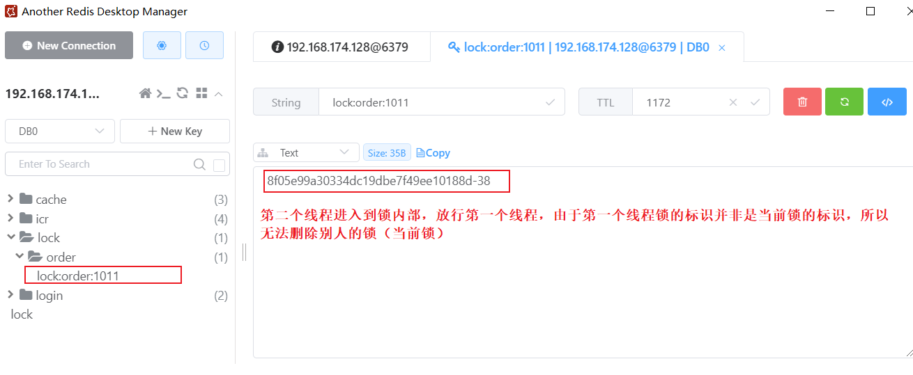 第一个线程进来,得到了锁,手动删除锁,模拟锁超时了,其他线程会执行lua来抢锁,当第一天线程利用lua删除锁时,lua能保证他不能删除他的锁,第二个线程删除锁时,利用lua同样可以保证不会删除别人的锁,同时还能保证原子性。