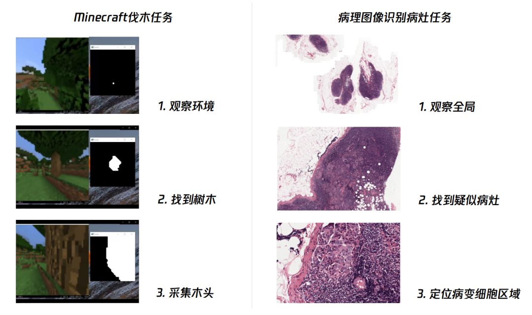 同样是环顾四周搜集全局信息(病理医生在低倍镜下扫片),然后锁定视角(高倍镜确认),找到木头后执行采集动作(确认病灶),如此往复。