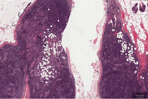喏,拿一张病理全片扫描图像,不用遍历所有高倍镜视野,也能找到病灶所在。