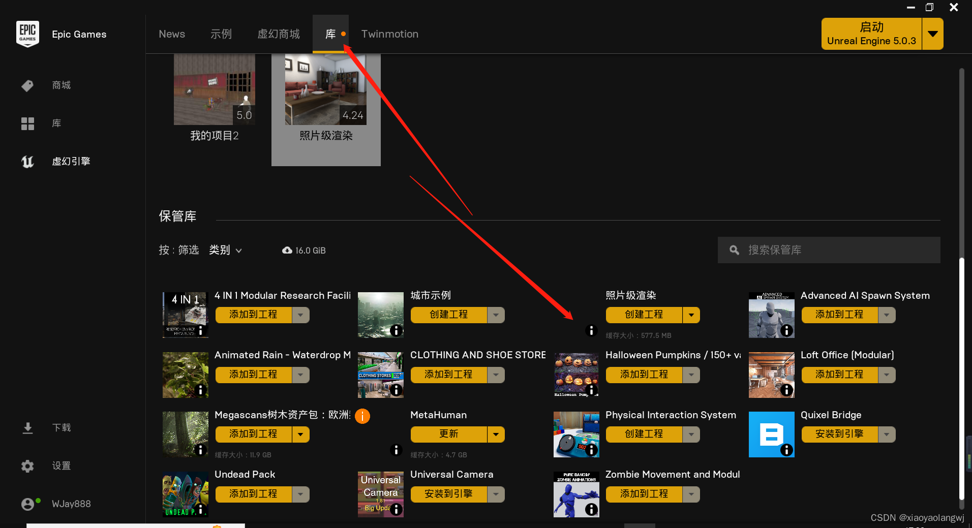 在EpicGames启动器中打开示例,找到这个照片级渲染。查看别人建好的效果图。
