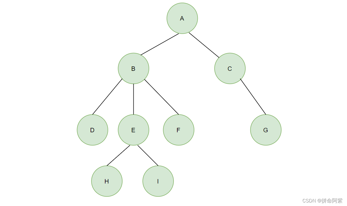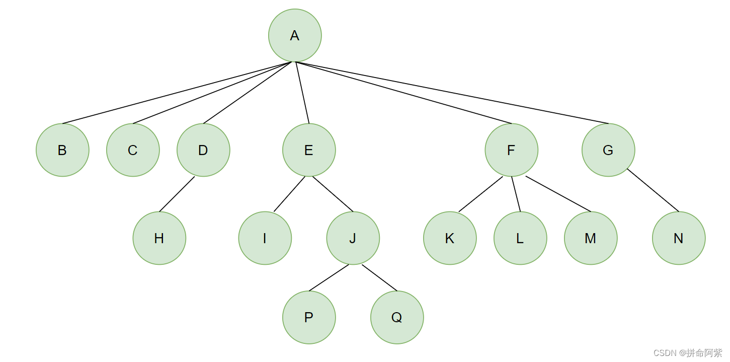 子孙:以某节点为根的子树中任一节点都称为该节点的子孙。如上图:所有节点都是A的子孙