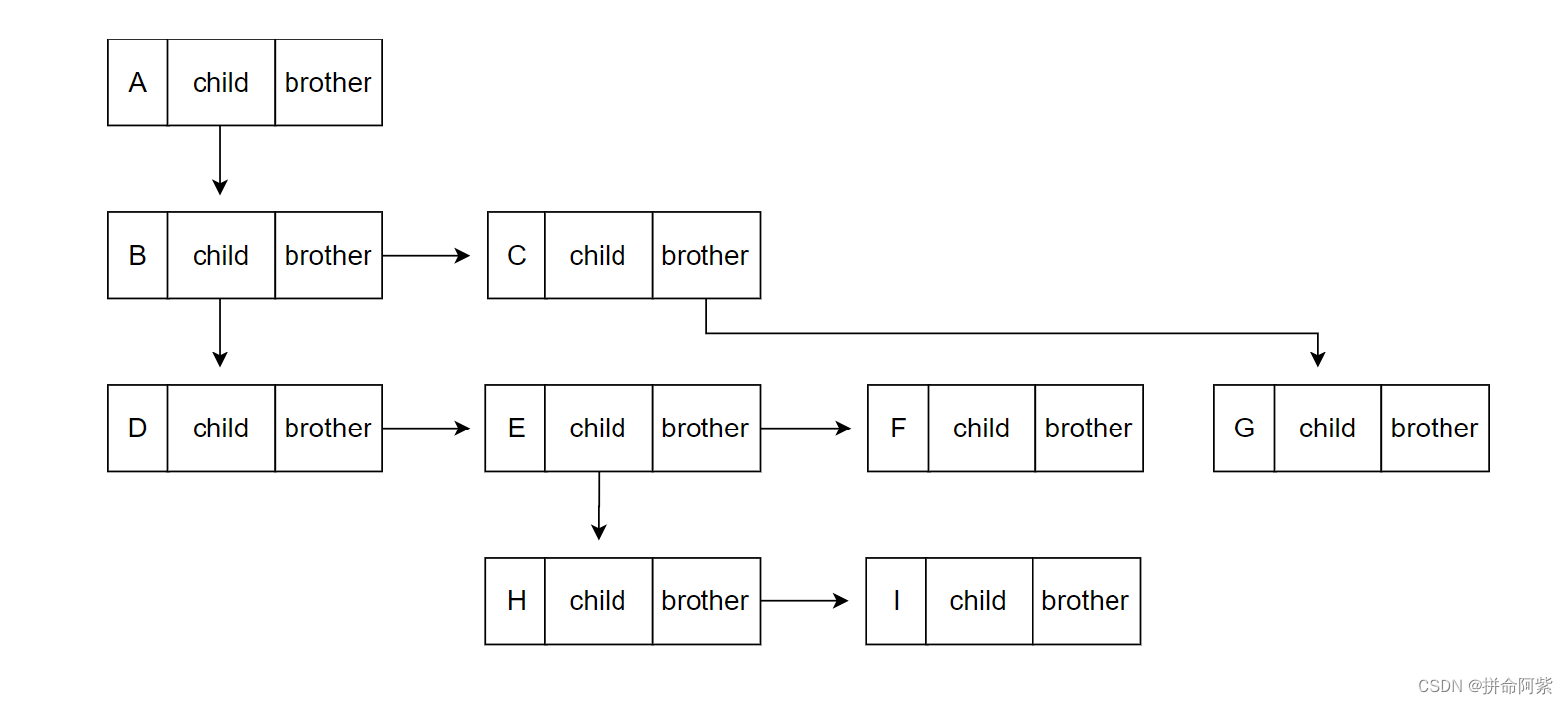 孩子兄弟表示法:每个节点都有数据域、孩子域、兄弟域,要是一个节点有多个孩子节点,那就让它的孩子域指向第一个孩子节点,它的第一个孩子节点跟它的第二个孩子节点又是兄弟关系,那么第一个孩子节点的兄弟域指向第二个孩子节点,第二个孩子节点又跟第三个孩子节点又是兄弟关系,让第二个孩子节点的兄弟域指向第三个孩子节点,依次这样。