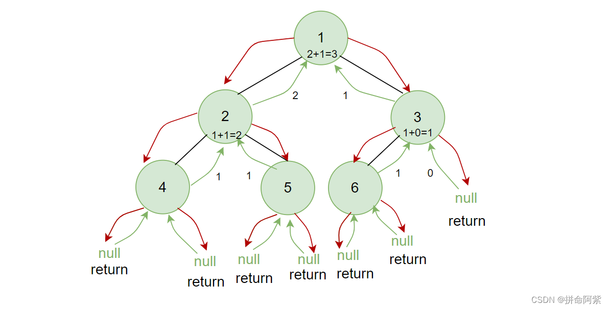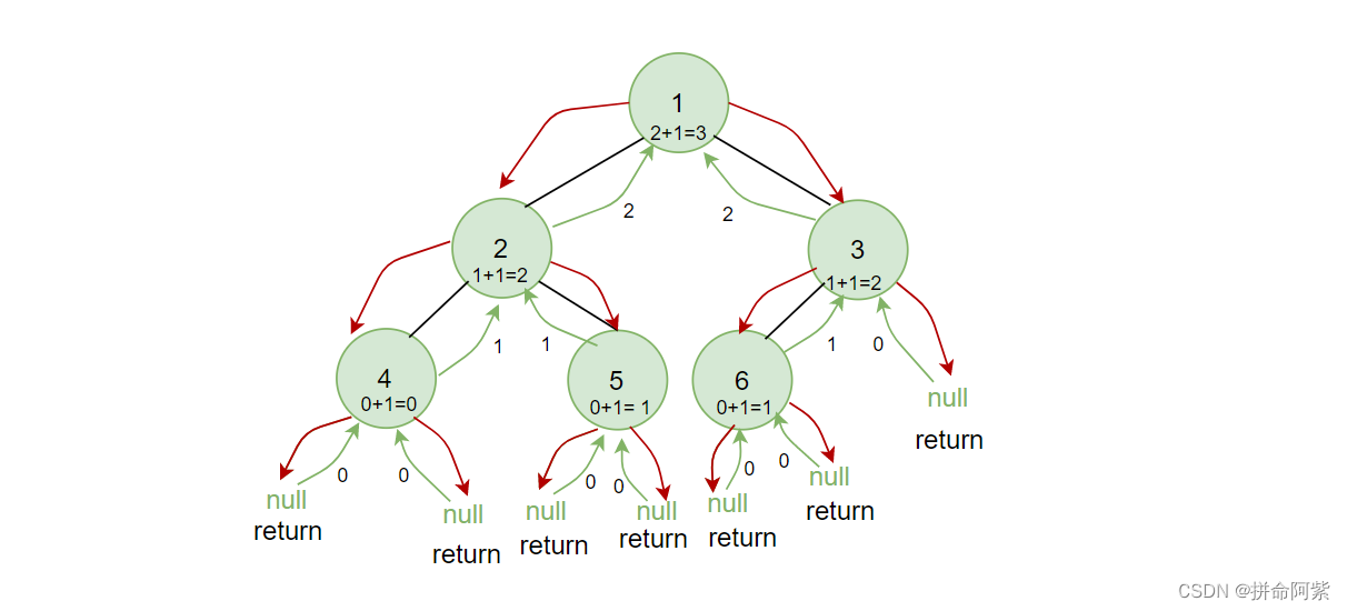 public int getHeight(Node root) {if (isEmpty(root)) {return 0;}//遍历左子树int left = getHeight(root.left);//遍历右子树int right = getHeight(root.right);//判断左子树和右子树谁的节点多,多的子树加上本节点返回给上一层return left >= right ? left+1 : right+1;