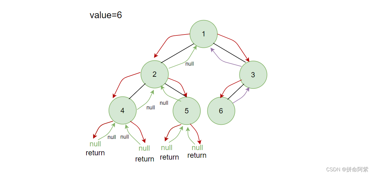 public Node find(Node root, int value) {if (isEmpty(root)) {return null;}//当元素存在直接返回这个元素的节点if (root.val == value) {return root;}//访问左子树Node nodeL = find(root.left,value);if (nodeL != null) {return nodeL;}//访问右子树Node nodeR = find(root.right,value);if (nodeR != null) {return nodeR;}//如果没有这个节点就返回nullreturn null;