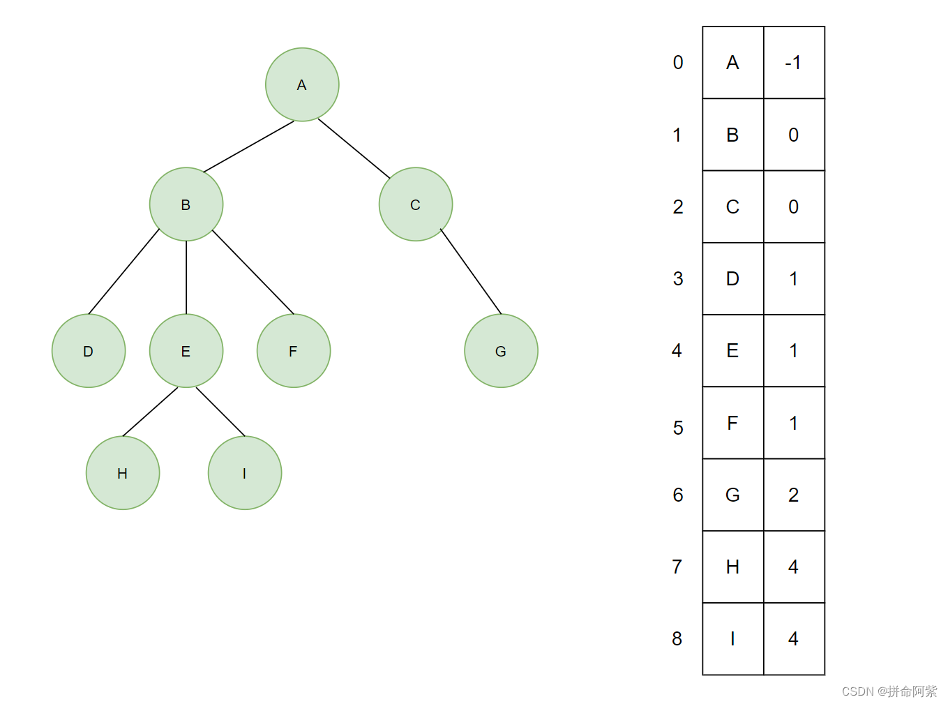 双亲表示法:就是将每个节点的双亲节点(父节点)存储在数组中,根节点没有父节点直接存储 -1 ,因为数组没有 -1 下标