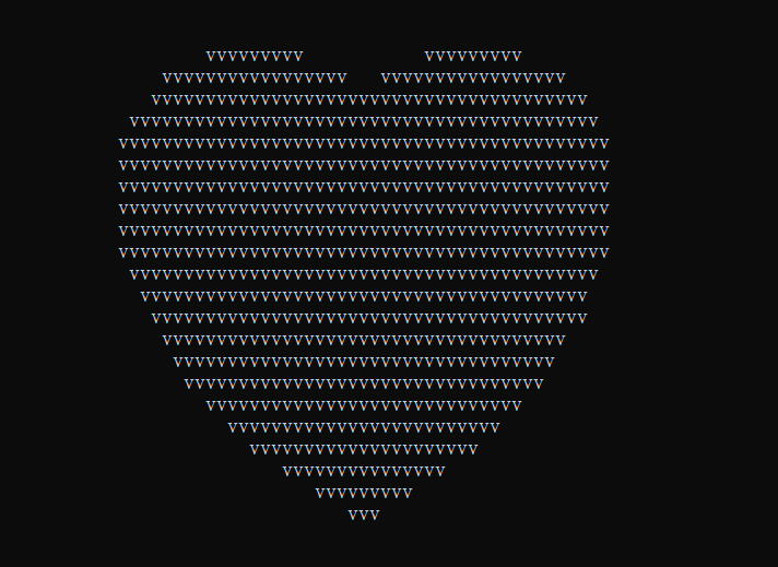 #include int main() {for (float y = 2.0f; y > -2.0f; y -= 0.1f) {for (float x = -2.0f; x < 2.0f; x += 0.05f) {float a = x * x + y * y - 1;putchar(a * a * a - x * x * y * y * y <= 0.0f ? 'v' : ' ');}putchar('\n');}