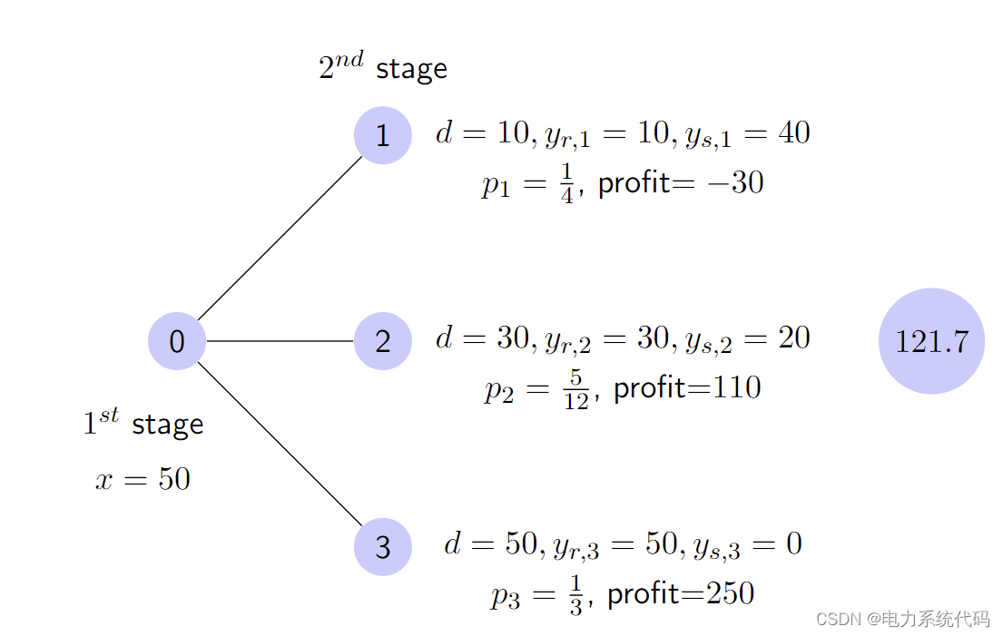 假设需求 d 是具有 S 个场景 (d1,...,ds) 的离散随机变量,每个场景 di 具有概率 pi。