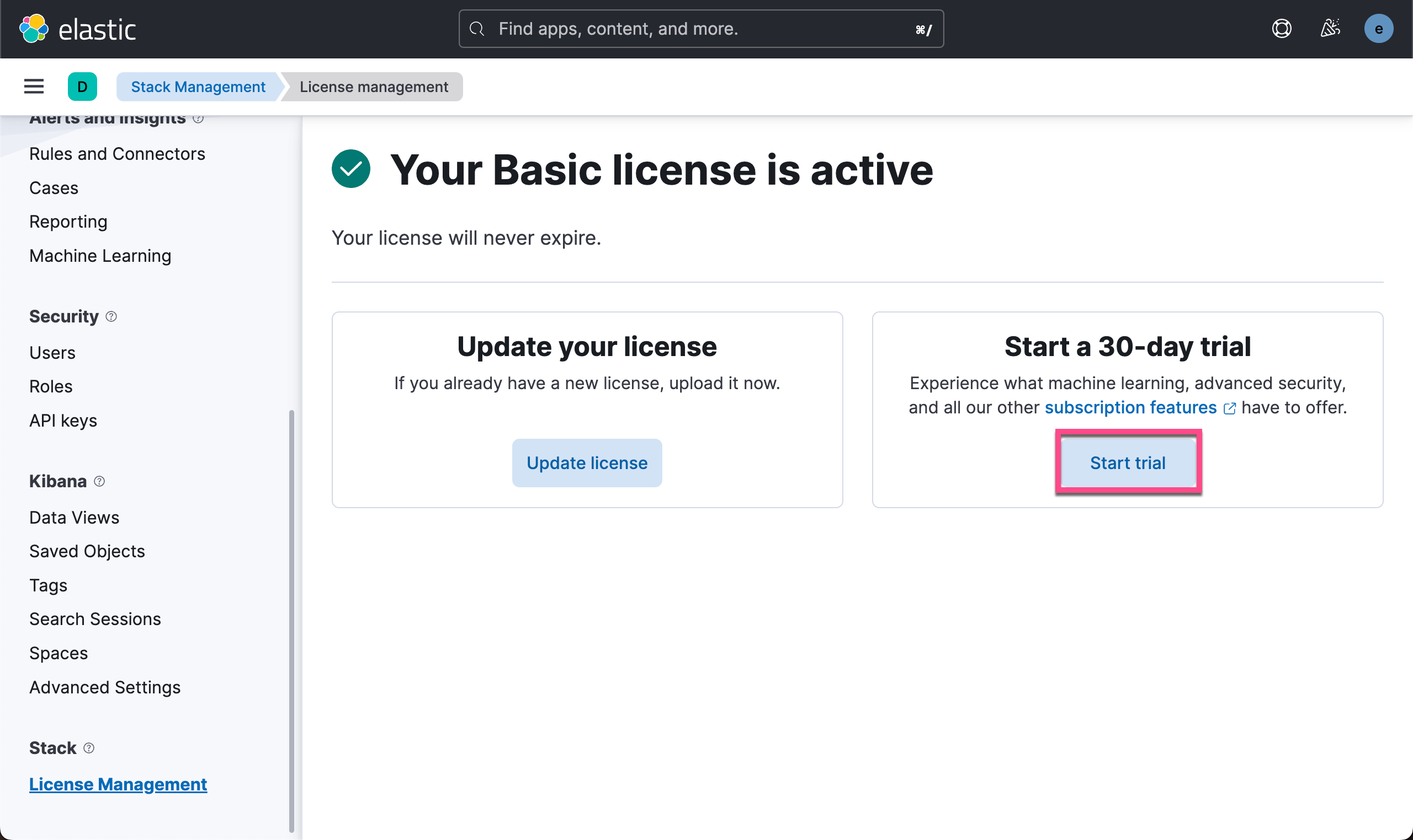 请注意文章中的 8.x 的安装部分。由于使用 eland 上传模型是白金版或者是企业版的功能,在我们的演示中,我们需要启动白金版试用功能: