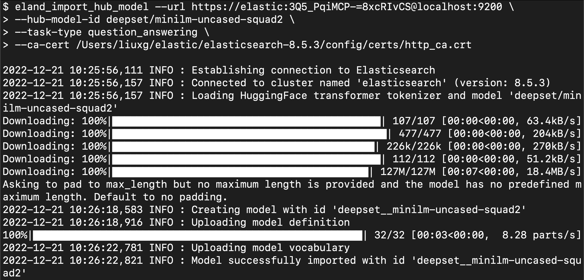 eland_import_hub_model --url https://elastic:3Q5_PqiMCP-=8xcRIvCS@localhost:9200 \--hub-model-id deepset/minilm-uncased-squad2 \--task-type question_answering \--ca-cert /Users/liuxg/elastic/elasticsearch-8.5.3/config/certs/http_ca.crt--start