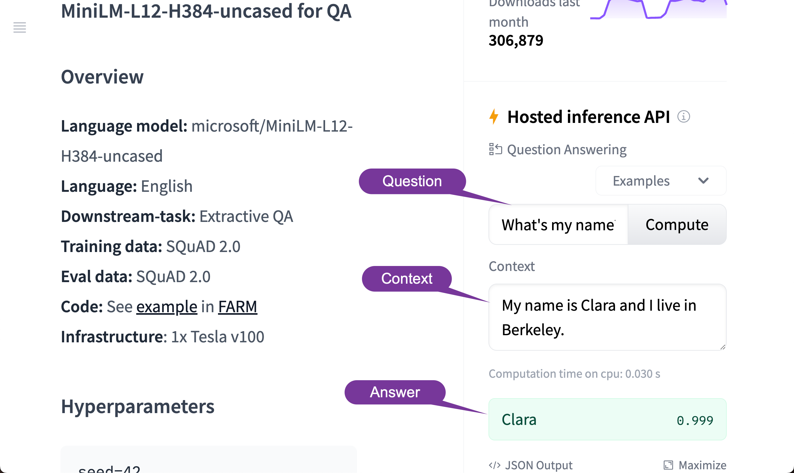 在此演示中,我们将使用随机 QA 模型,但你可以随意导入要使用的模型。 你可以在 Hugging Face 网页上阅读有关此模型的更多详细信息。