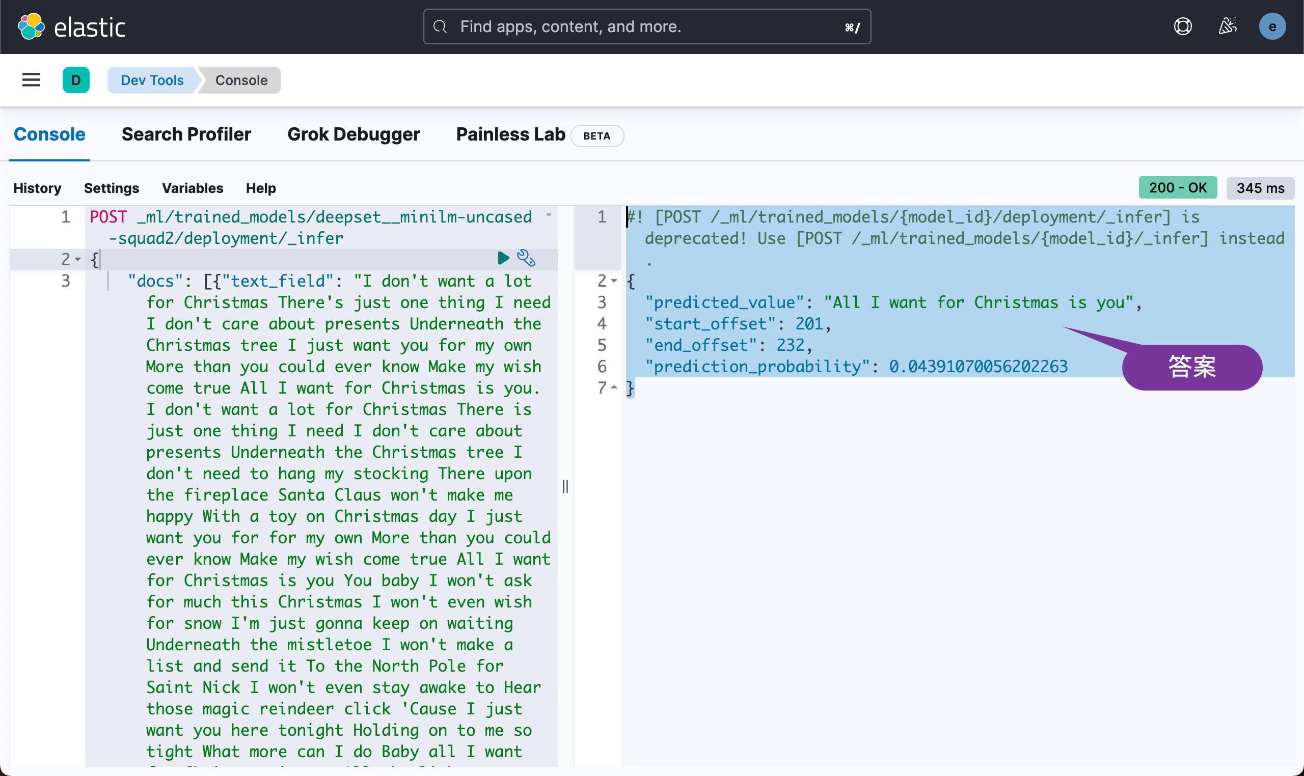 一旦模型分配完成,我们就可以进行推理,使用推理处理器来评估模型。 对于这个演示,我们将使用圣诞歌词作为我们的背景,这将允许我们对我们最喜欢的圣诞歌曲提问。