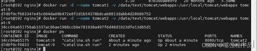 docker run -d --name tomcat2 -v /data/text/tomcat/webapps:/usr/local/tomcat/webapps tomcat:9