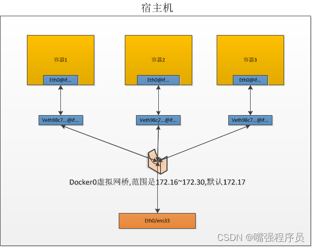 Docker每次创建容器都会同时创建一组互联的网络接口,你可以理解为一根管道的两端, 这组接口一端作为容器的eth0接口,另一端命名类似于veth966865c@if100这样的名字,作为宿主机的一个端口。可以将veth接口的理解为虚拟网线的一端,这个虚拟网线一端插在名为docker0的网桥上,另一端插到容器中。通过这种方式Docker创建了一个虚拟子网,这个虚拟子网被宿主机和所有的Docker容器共享。