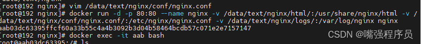 docker run -d -p 80:80 \--name nginx -v /data/text/nginx/html/:/usr/share/nginx/html \-v /data/text/nginx/conf/nginx.conf/:/etc/nginx/nginx.conf \-v /data/text/nginx/logs/:/var/log/nginx nginx