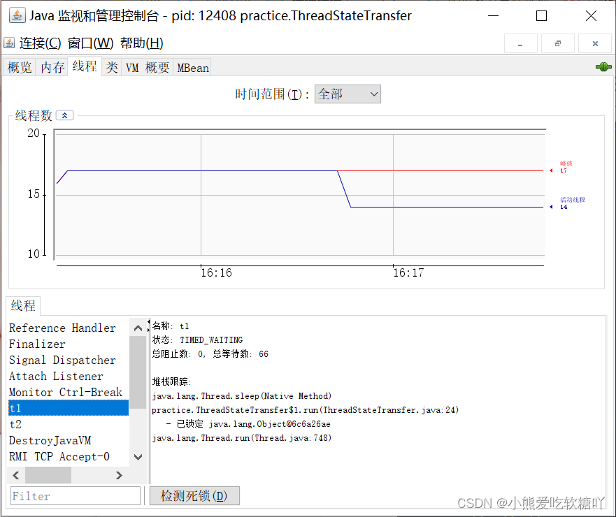 在本机下载jdk的文件中打开bin目录找到当中的jconsole.exe 文件,这是java中自带的调试,点击连接。可以查看线程t1、t2的状态。
