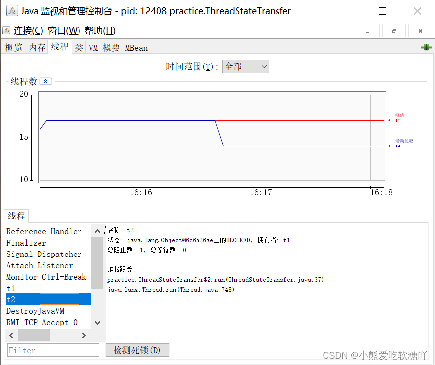 代码中使用Thread.sleep(10000),此时线程t1是TIMED_WAITING状态,而t2则是BLOCKED转态。