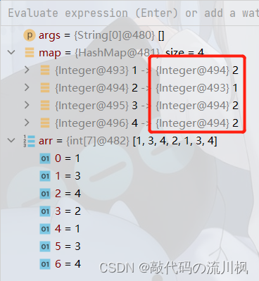 public static void main(String[] args) {HashMap map = new HashMap<>();int[] arr = {1,3,4,2,1,3,4};for (int i = 0; i < arr.length; i++) {int key = arr[i];if(map.get(key)==null){map.put(arr[i],1);}else{int val = map.get(key);//key出现的次数map.put(key,val+1);}}System.out.println("");for (Map.Entry entry:map.entrySet()) {System.out.println("key: "+entry.getKey()+"出现次数: "+entry.getValue());}}