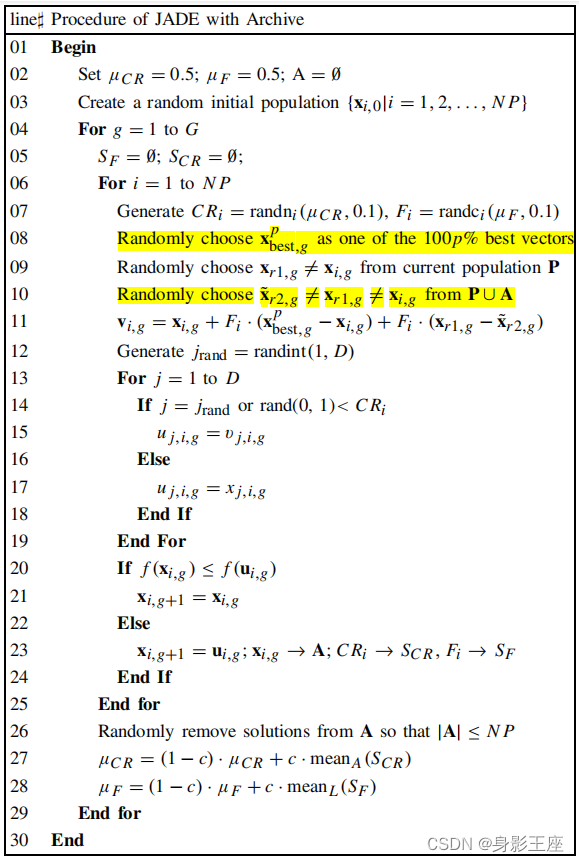 其中x_{\text {best, } g}^{p}被随机选择为当前种群中前100p%的个体之一,p∈(0,1],p决定了突变策略的贪婪性,p越大,突变后种群的多样性越高。而\tilde{\mathbf{x}}_{r 2, g}是从P∪A中随机选择的,引入A也是想提高突变后种群的多样性。