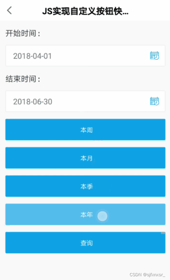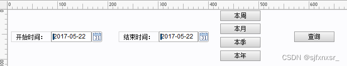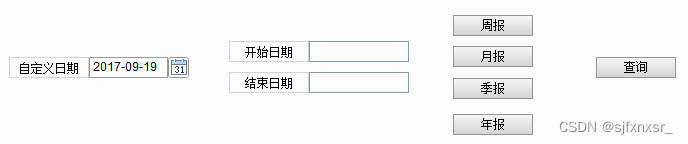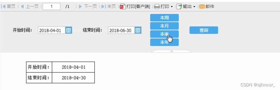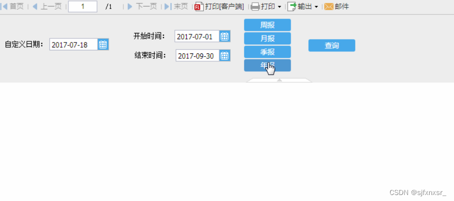 周报、月报、季报、年报中有参数查询时,每次都需要手动选择,比较繁琐,所以就需要一种快速筛选的方法,只需点击某个按钮,就能准确定位到合适的时间范围,如下图所示: