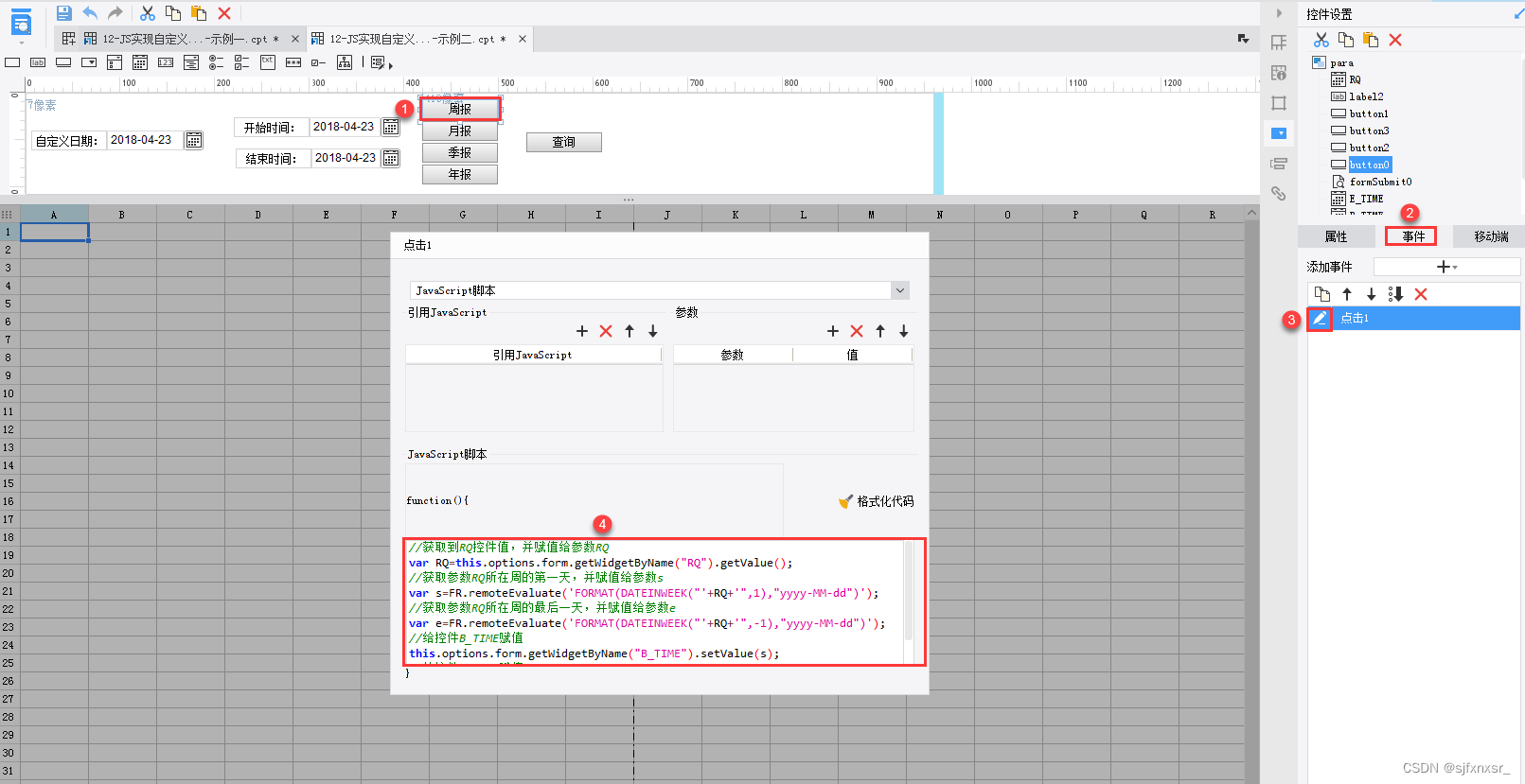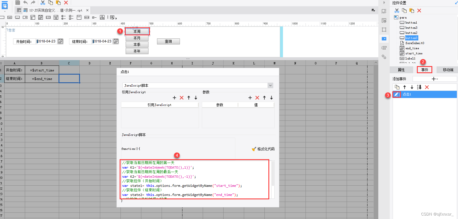 3)同上述方法添加本月「按钮控件」、本季「按钮控件」、本年「按钮控件」,并分别为其添加「点击」事件。